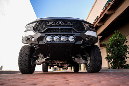 Transform the front of your Ram TRX with the Addictive Desert Designs Bomber Ram TRX Front Bumper. The modern sheet metal design brings aggressive styling while maintaining a low profile. The center of the bumper provides inset mounting points for four Rigid 360 6 inch round lamps, while each side panel provides a cube-shaped mounting point for lamps.