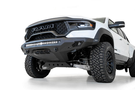 De Stealth Fighter voorbumper heeft een plat stalen plaatontwerp. De afgeronde voorkant sluit goed aan op de voorkant van je Ram TRX en volgt de belangrijkste carrosserielijnen, waardoor het lijkt alsof hij zo uit de fabriek komt. Een universeel montagesysteem voor lampen maakt het mogelijk om een gebogen lichtbalk van 40 inch of kubusvormige lampen in het midden van de bumper te plaatsen, en er zijn twee extra kubusvormige lampbevestigingen achter elk zijpaneel.
